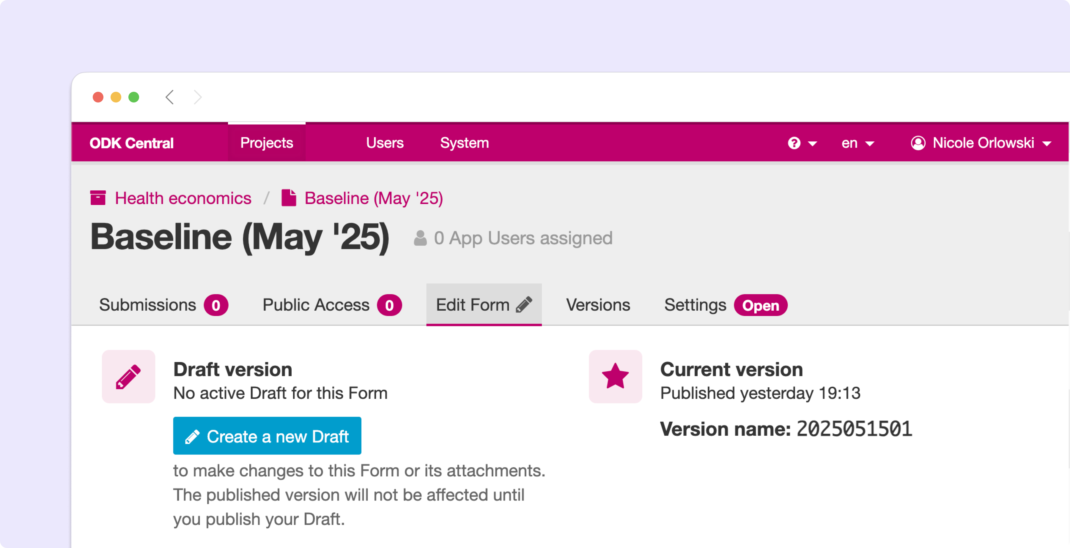 Form drafting is where you design the Form itself, laying out many details like the questions and acceptable responses. ODK Central itself does not help with form design: instead, please take a look at the introduction to form design for help creating your form. Central does, however, help with testing your design, with Form Drafts. When you first upload your Form, it will be a Draft to which you can connect a mobile device and submit test data. If you are not satisfied with the Form, you can adjust the design and upload a new version in place of the old Draft. Once you are satisfied, you can Publish the Form to make it ready for use.
